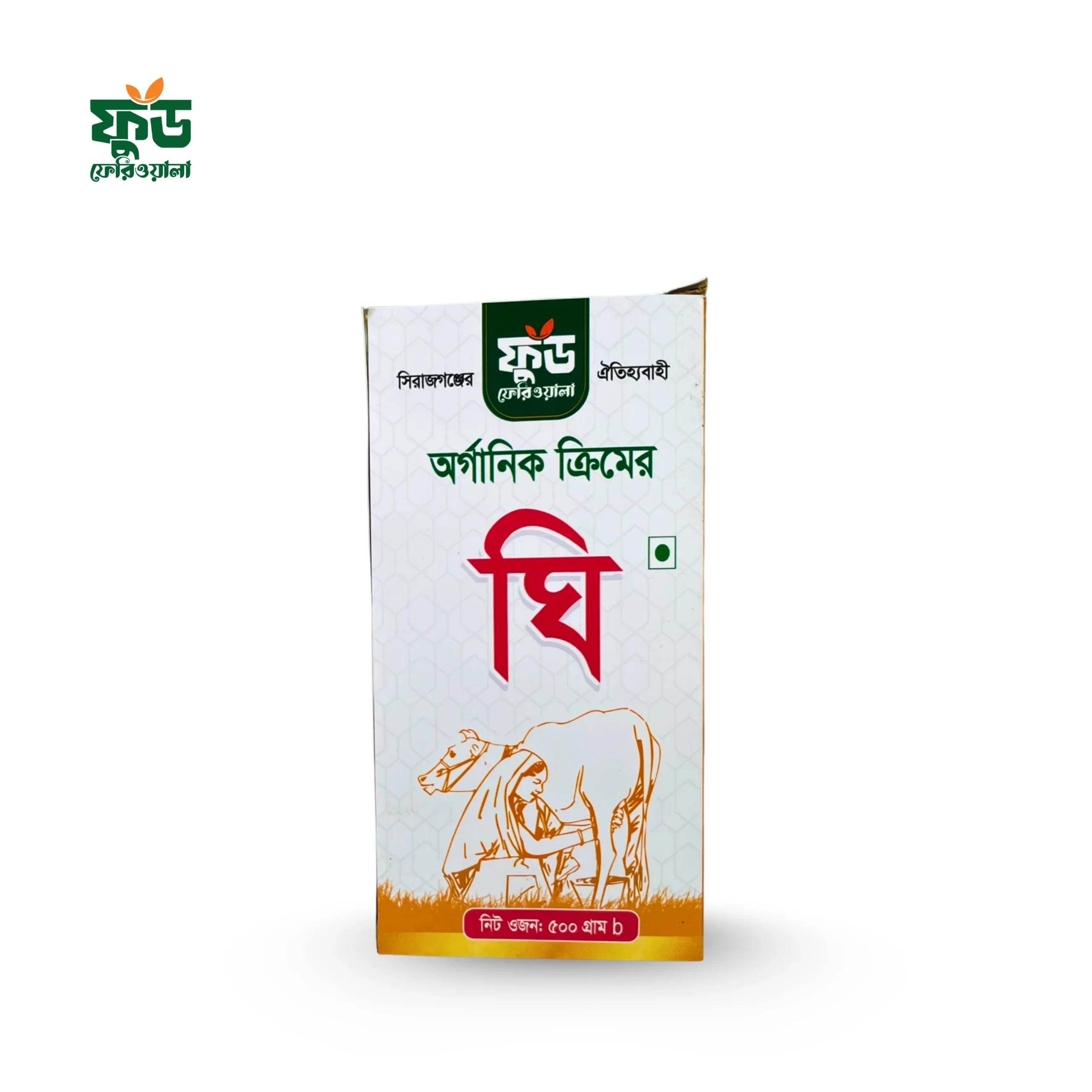 “ফুড ফেরিওয়ালা অর্গানিক ক্রিমের ঘি” হলো ঐতিহ্যবাহী সিরাজগঞ্জের দেশীয় গাভীর দুধ থেকে সরাসরি আলাদা করা ক্রিম (Cream) থেকে তৈরি করা ঘি। যা সিরাজগঞ্জের ঐতিহ্য সম্পূর্ণরূপে অটুট রেখে প্রস্তুত হয়, যেখানে দুধের সর্বোচ্চ মানের ফ্যাট অংশ থেকে তৈরি, ফলে এটি সুগন্ধি, সুমিষ্ট এবং অত্যন্ত পুষ্টিকর।